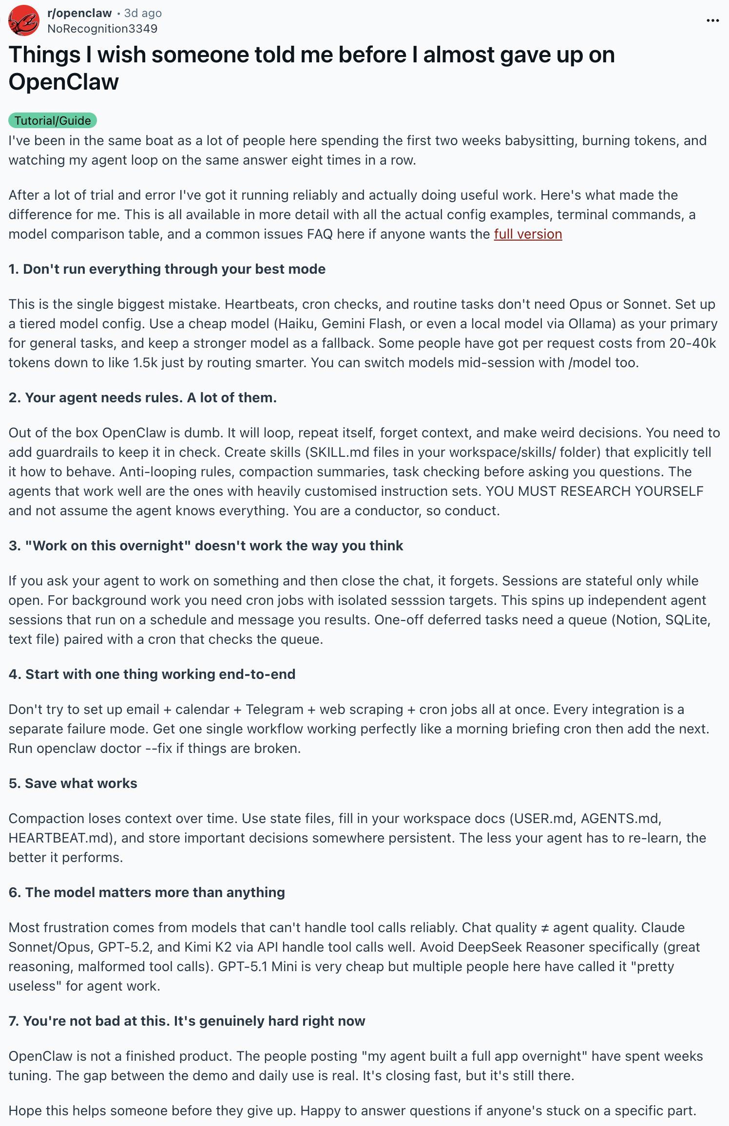 A guide shared lessons from someone who almost quit using OpenClaw before figuring it out: