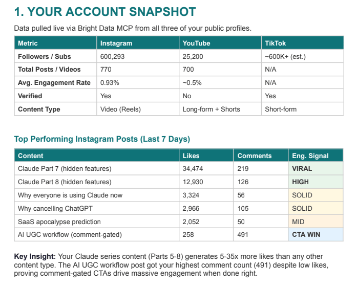 Bright Data collects the data. It connects to social platforms and pulls structured information — profiles, posts, metrics, captions, related accounts, timestamps — everything. Claude receives that data directly through MCP. No exporting. No copy-pasting. No file downloads. Then Claude analyzes everything: it reads every caption, compares engagement rates, identifies content patterns, spots gaps, and generates specific recommendations.