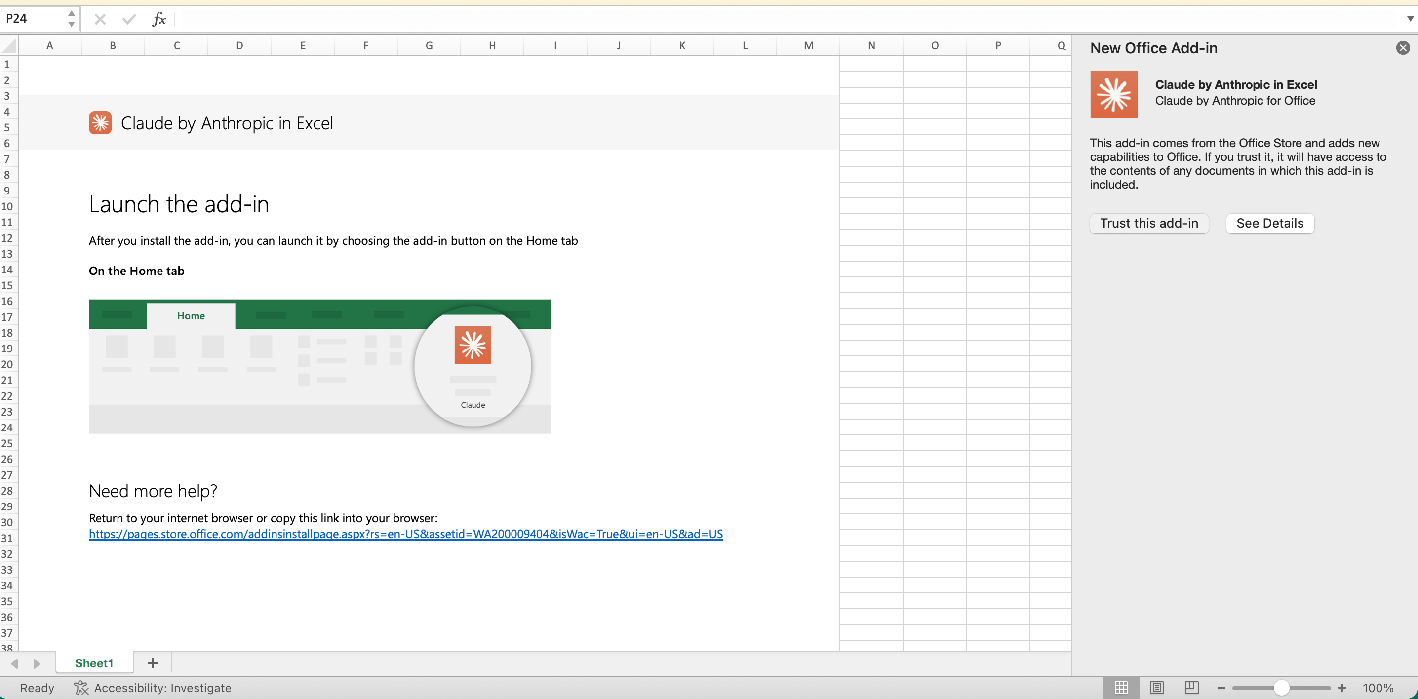 Claude in Excel is an add-in. It sits in a sidebar inside Microsoft Excel.