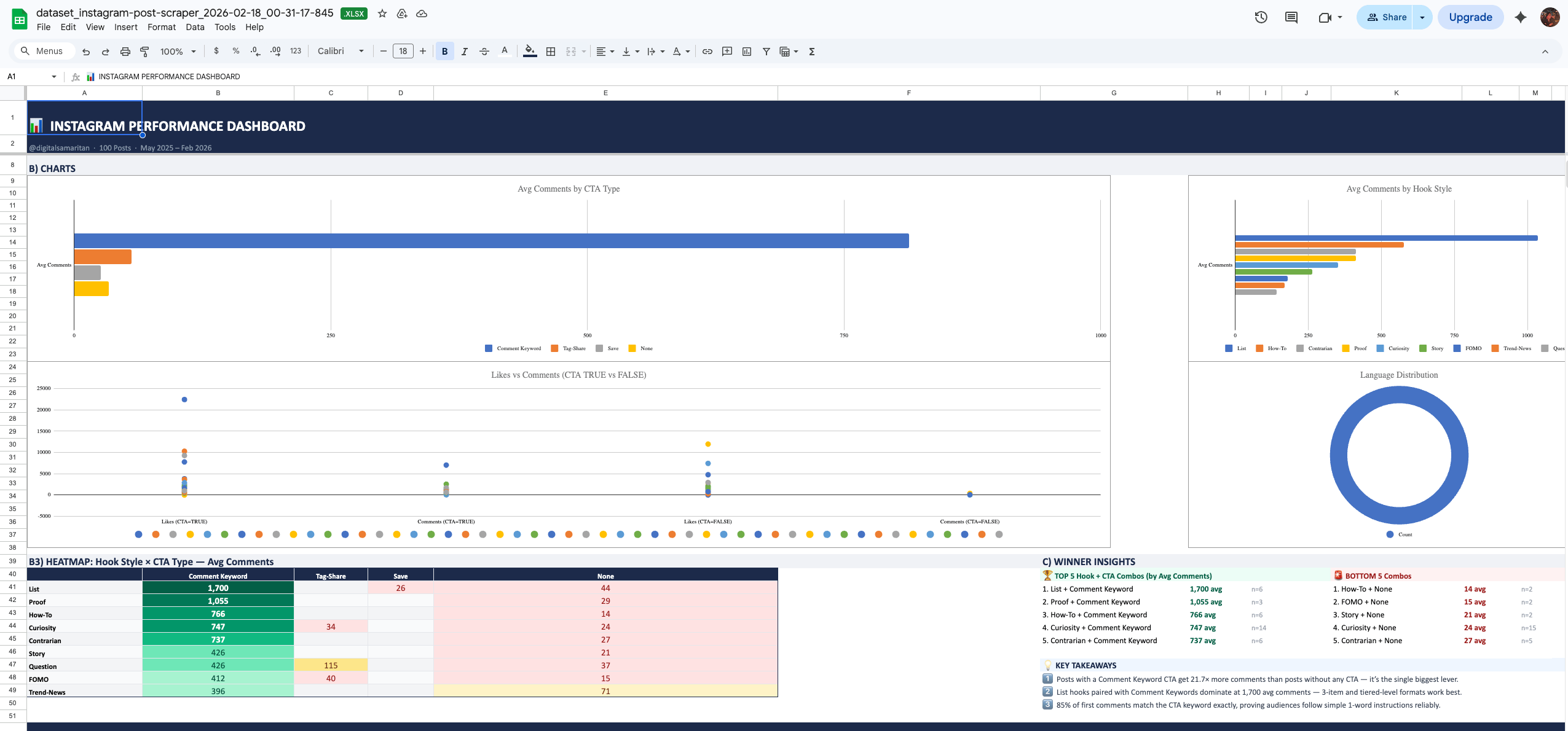 "Which rows have the highest engagement rate? Is there a pattern?"Real example: I used this on my own Instagram analytics data. I had a spreadsheet of 90 days of post performance β reach, likes, saves, shares, profile visits β data I'd originally scraped and extracted using Claude. Instead of building pivot tables, I just asked Claude to tell me which content format was driving the most profile visits, and whether posting time had any correlation with reach.